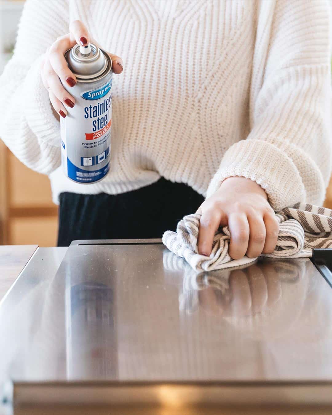 1. A little Sprayway Stainless Steel Cleaner and Polish goes a long way. Just spray a small amount on a clean cloth and wipe it on the surface to be cleaned. Re-wipe and gently buff to leave a shine. Use Sprayway Stainless Steel Cleaner and Polish regularly to keep your stainless steel appliances and surfaces looking showroom-new!